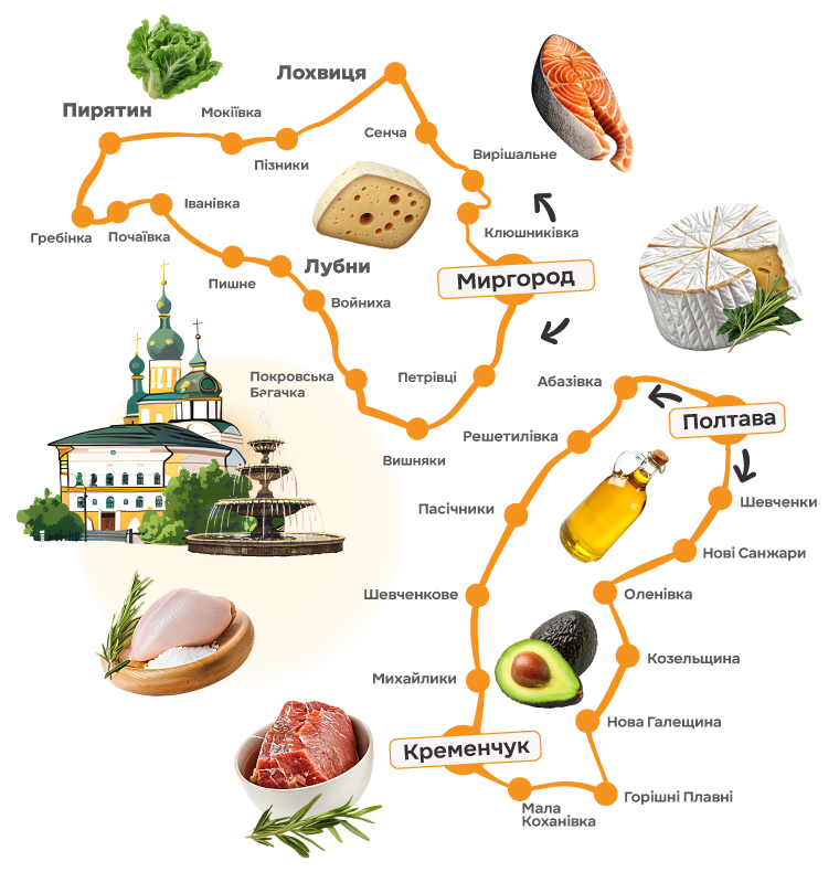 Веземо смачненьке у понад 80 населених пунктів Полтавщини! Щоб перевірити, чи доступна доставка у ваше місто або селище, просто додайте свою актуальну адресу в застосунку «Сільпо» або на сайті silpo.ua.