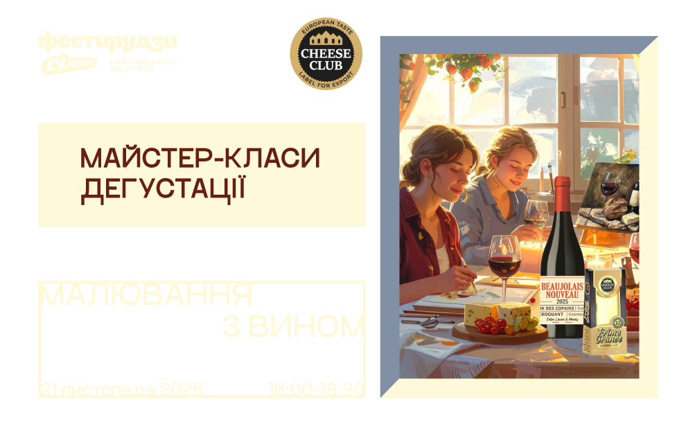 Куштуватимемо витриманий сир Prima Grande – пікантно-вершковий та щільний, а також червоне Beaujolais Nouveau із Франції – свіже та ягідне.
