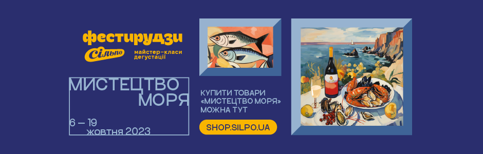 Ловіть натхненний бриз у «Сільпо». З 6 по 19 жовтня Фестирудзи завітають з дивовижним фестивалем «Мистецтво моря» в наші магазини. На вас чекає яскравість рибки, витонченість устриць, вишукані форми щупалець та хвиля творчості з ігристим та морепродуктами.