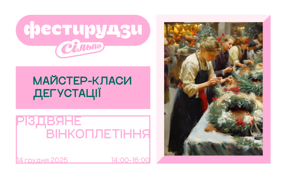 Різдвяне вінкоплетінняСвятковий настрій починається з маленьких деталей: різнобарвних гірлянд, м'якеньких пледів чи ароматних свічок. А ще святковість можна створити власноруч! 14 грудня з 14:00 до 16:00 на майстер-класі від Фестирудз зробимо різдвяний вінок.