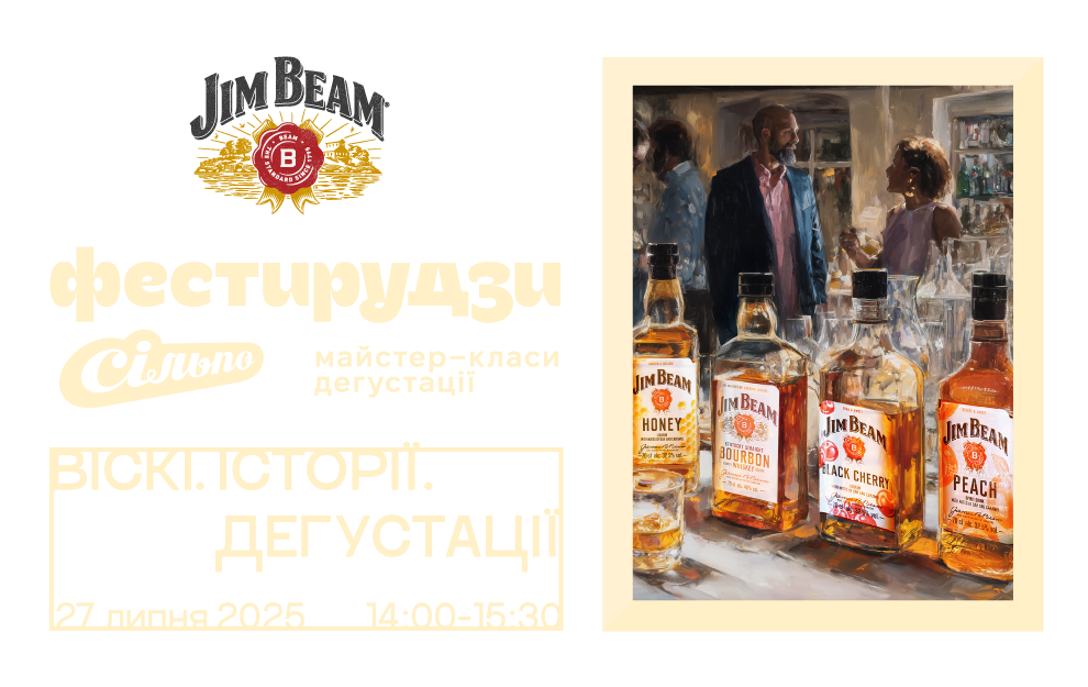 На дегустації Jim Beam від Фестирудз «Віскі. Історії. Дегустації» в затишній атмосфері ви зможете скуштувати різні види бурбону та віскі: Jim Beam White Straight Bourbon, Jim Beam Apple, Jim Beam Red Stag Black Cherry, Jim Beam Honey, Jim Beam Peach. Пригощатимемо також двома коктейлями на основі Jim Beam.
