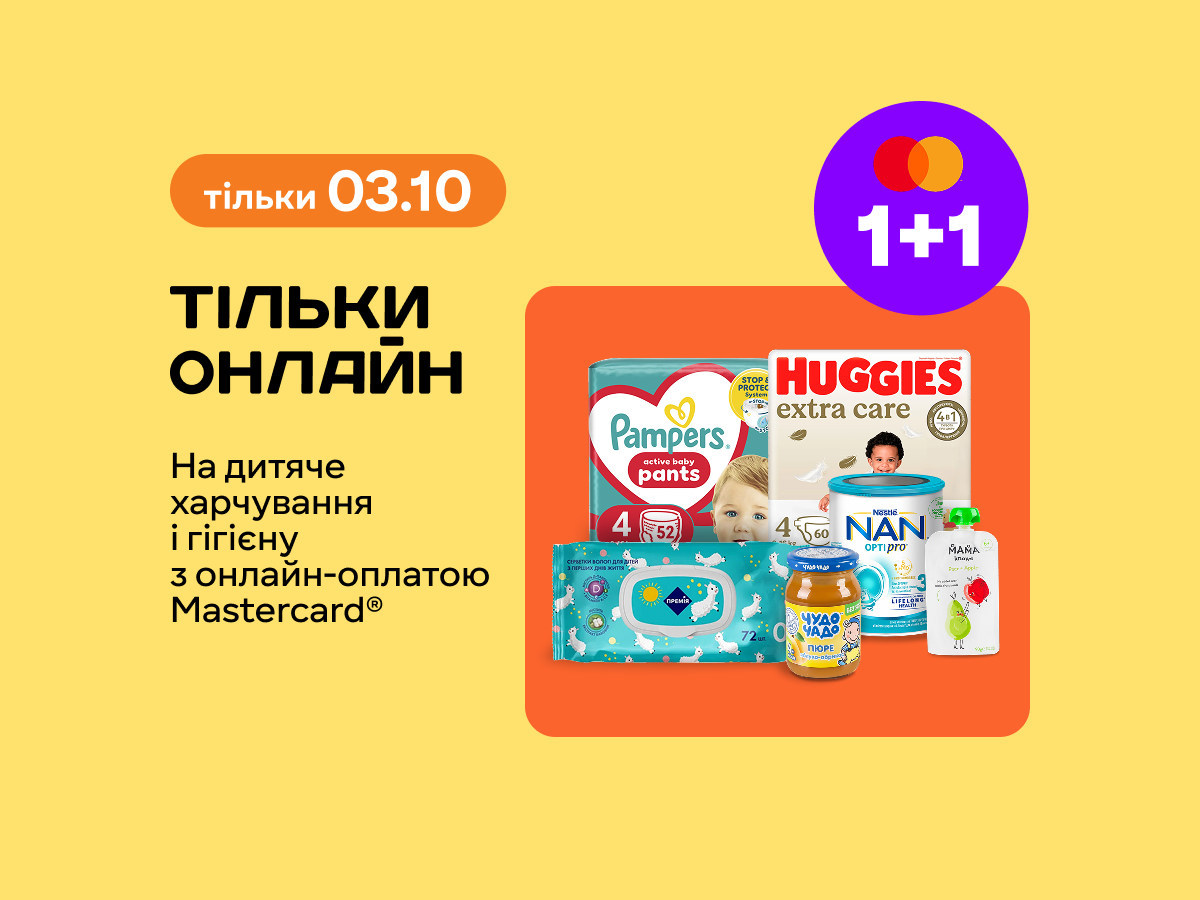 Вигідно ульотно: тільки 03.10.2025 діє 1+1 на дитяче харчування і гігієну при оплаті тільки онлайн карткою Mastercard. Купуєте один товар з обраного асортименту категорій «Дитячі підгузки та серветки» та «Дитяче харчування» — другий дешевший отримуєте за 0,19 грн. Поєднання акційних товарів в межах однієї категорії довільне.Одним чеком можна придбати до 3 товарів за повною ціною та до 3 товарів за 0,19 грн у кожній категорії. Важливо: акція діє тільки при оплаті онлайн картою Mastercard. Правила акції за посиланням.