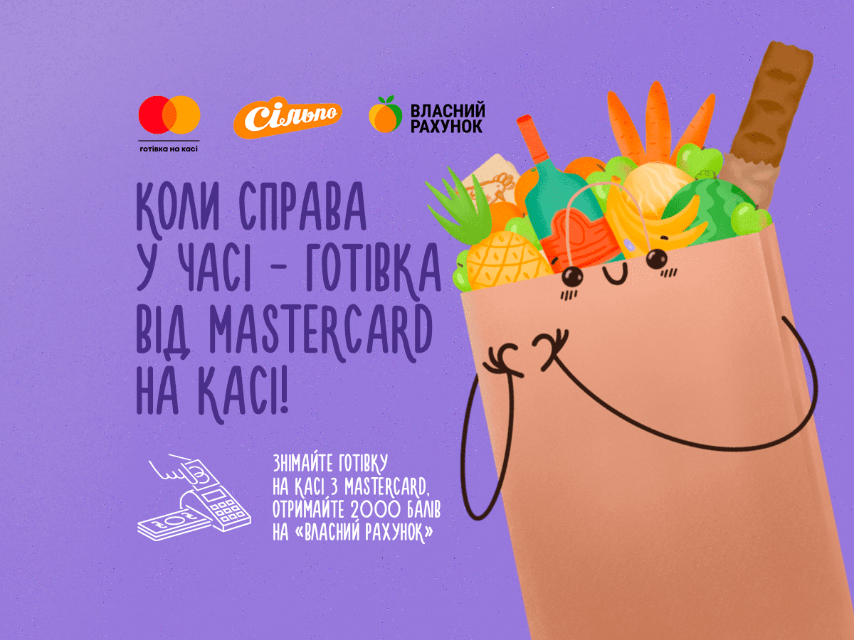 Акція діє за умови сплати будь-якої суми покупки на касі карткою Mastercard® у період з 10.11.2021 до 10.12.2021 включно по всій мережі магазинів «Сільпо». За одну операцію можливо зняти не більше, ніж 500 грн. Нарахування 2000 балів на «Власний Рахунок» здійснюється при першому знятті будь-якої суми готівки у період акції.