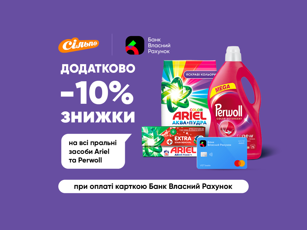 Акція діє з 05.11 по 30.11.2025 з Власним Рахунком у супермаркетах «Сільпо», на silpo.ua та в застосунку «Сільпо» — на пральні засоби ТМ Ariel та ТМ Perwoll.