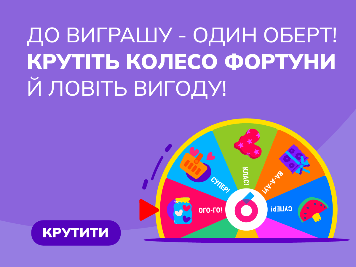 Кожен виграш — це сюрпри-и-из! Колесо Фортуни з радістю потішить вас додатковими пропозиціями, з якими ваш шопінг буде ще вигіднішим. Покрутили Колесо? Очікуйте виграш всього за кілька хвилин, далі за покупочкою в «Сільпо» – і вигода ваша!