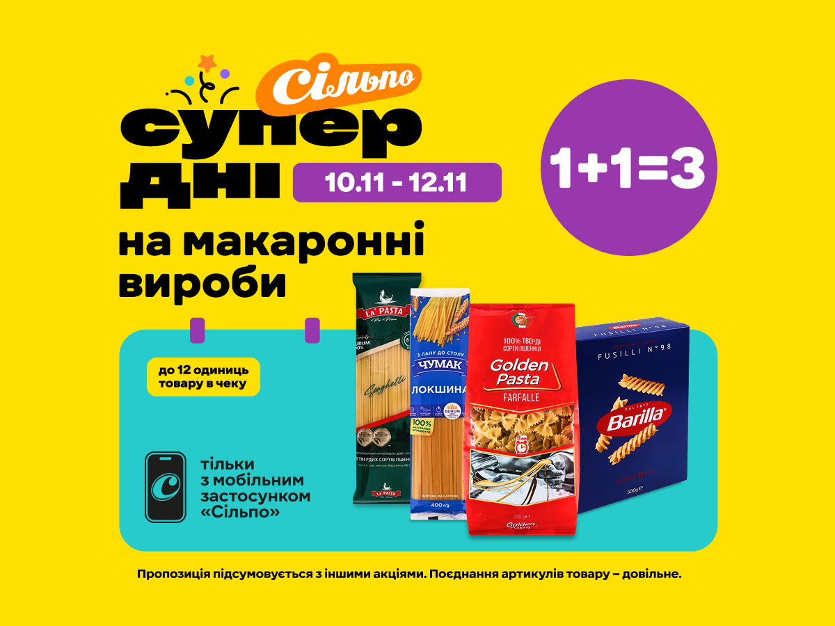 * Під пропозицією «1+1=3» мається на увазі, що в разі купівлі двох одиниць товару категорії «Макаронні вироби» за повну вартість, зазначену на ціннику, ви маєте можливість придбати другу одиницю категорії за ціною 0,19 грн, за умови купівлі трьох товарів одним чеком. Ціну 0,19 грн буде застосовано на товар меншої вартості.