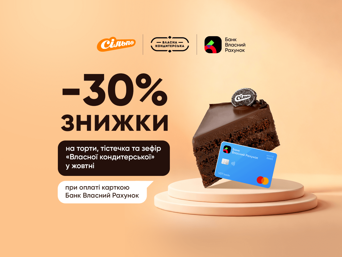 Акція діє з 08.10 по 31.10.2025 з Власним Рахунком у супермаркетах «Сільпо», на silpo.ua та в застосунку «Сільпо» на торти, тістечка та зефір Власної кондитерської. Максимальний розмір знижки на період акції — 450 грн. Акція не підсумовується з іншими спеціальними пропозиціями. Деталі та інші умови акції — на silpo.ua або за тел. гарячої лінії 0 800 301 707 (дзвінки безкоштовні в межах України).