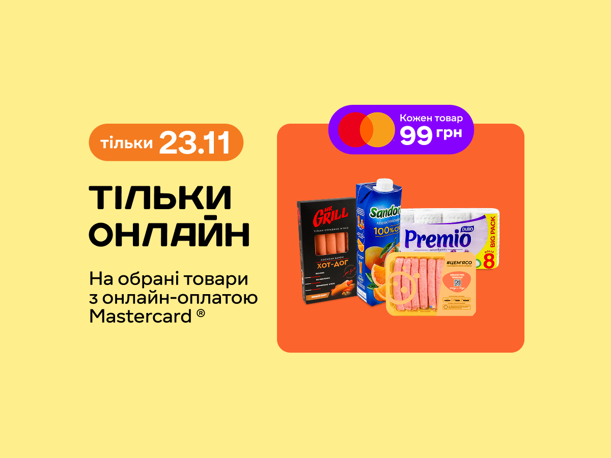 Пропозиція в межах акції «Спеціальна ціна з Mastercard®» діє 23.11.2025 на silpo.ua та в застосунку «Сільпо» на Обрані акційні товари, що відмічені спеціальним баблом «99 грн», за умови наявності товару та оплати покупки онлайн карткою Mastercard®. Під пропозицією «Спеціальна ціна» мається на увазі можливість придбати Обрані товари за ціною 99 грн за умови оплати онлайн карткою Mastercard®. Кожен гість може придбати до 6 одиниць кожного акційного товару. Вигляд товару може відрізнятися від зображеного в рекламі. Акція не поширюється на сервіс/доставку LOKO. Деталі пропозиції — на silpo.ua або за телефоном гарячої лінії 0 800 301 707.